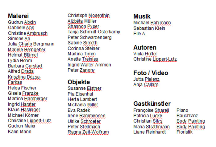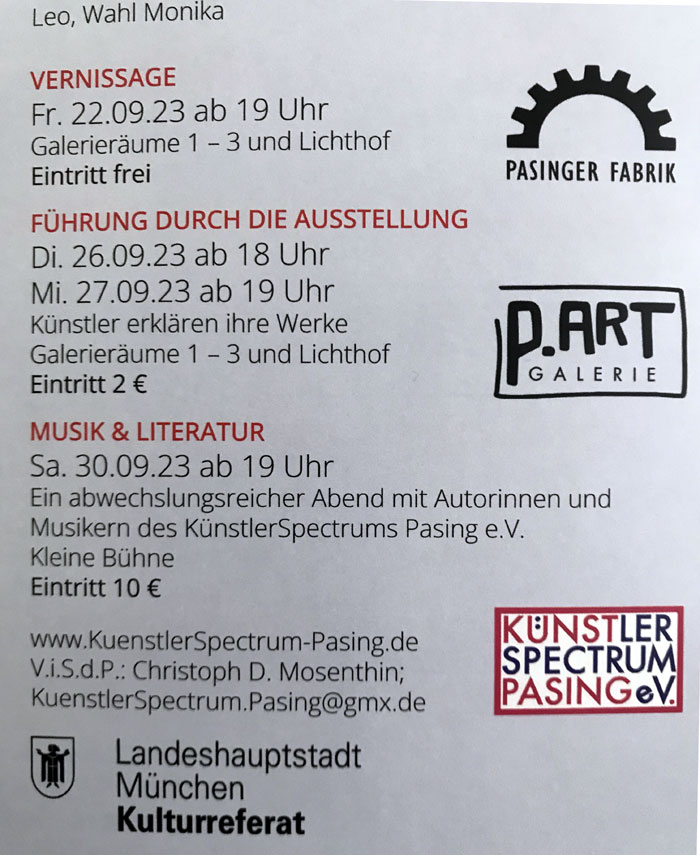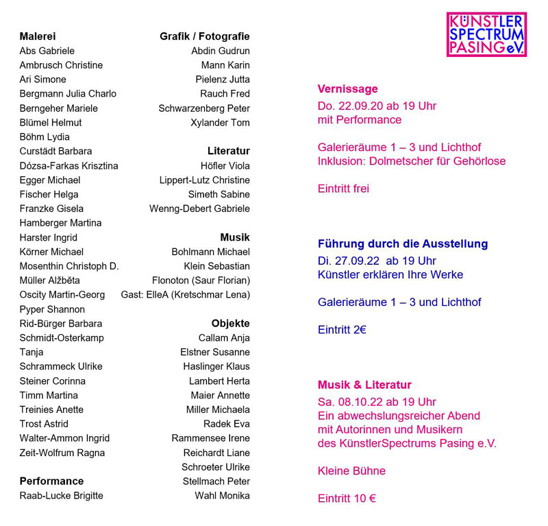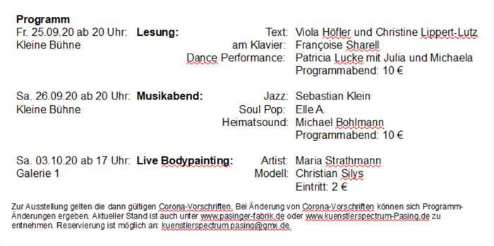 Genauere Informationen werden im Veranstaltungskalender auf www.kuenstlerspectrum-pasing.de nachzulesen sein. |