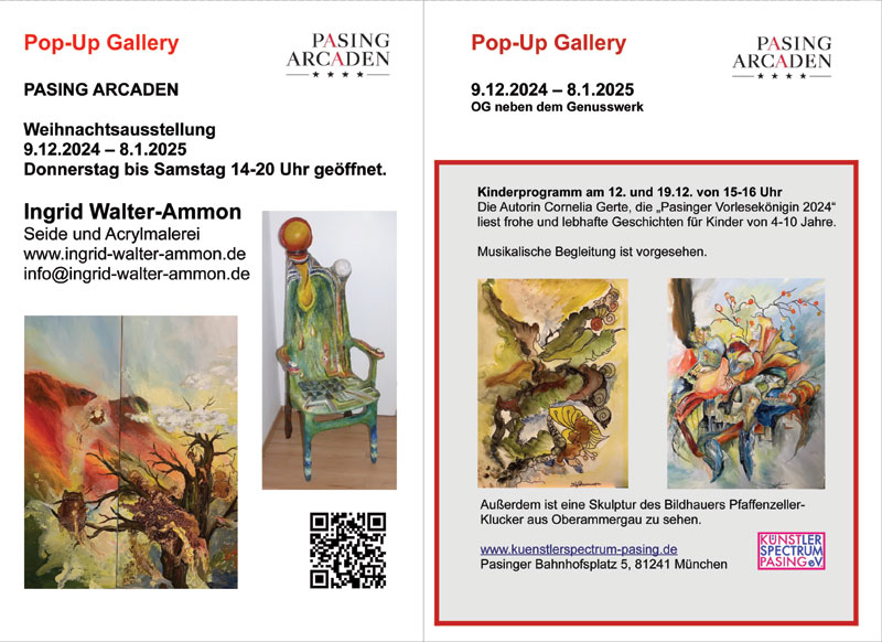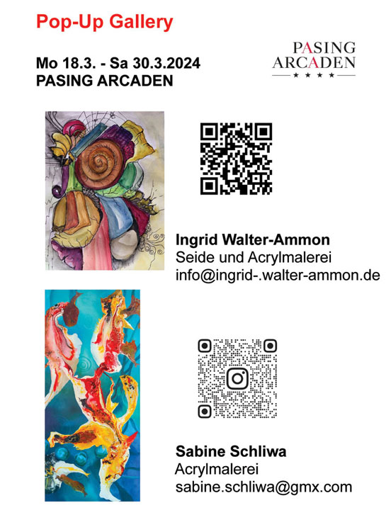 Gruppenausstellung: Ingrid Walter Ammon (große Seidenwandbilder und Acryl), Michaela Miller (Papierkunst) und Lydia Böhm (Aquarelle). Ausstellung im 1. Stock der Pasinger Arcaden