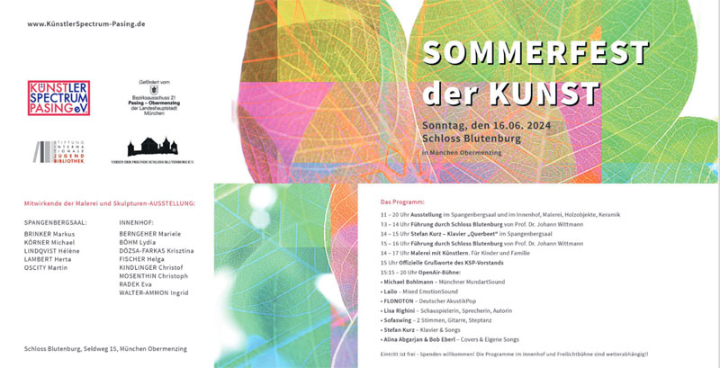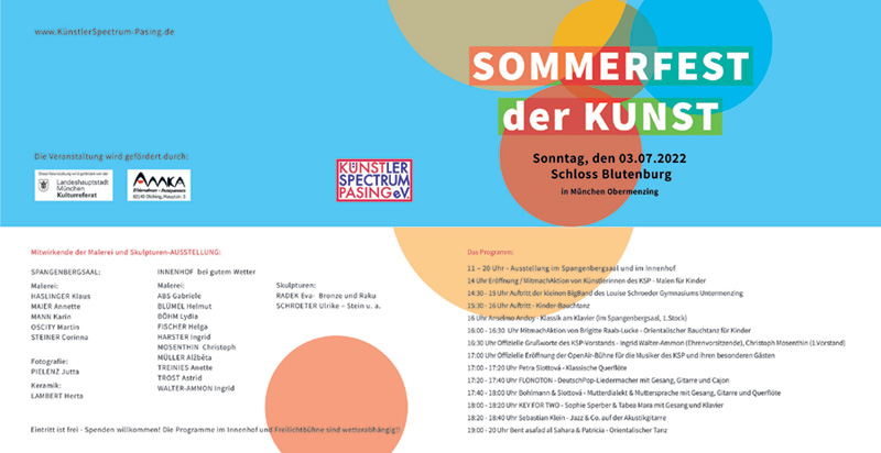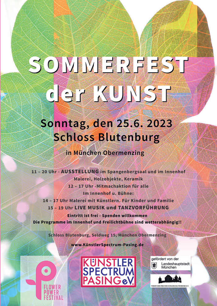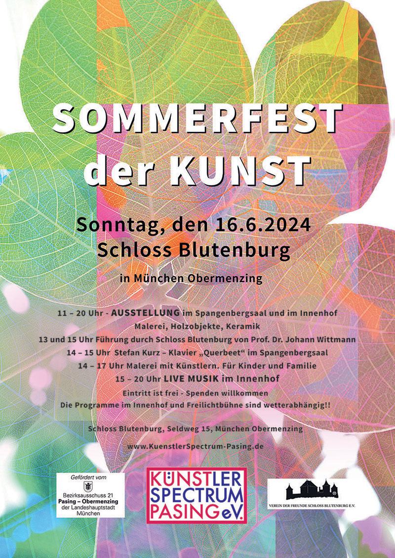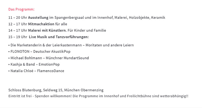 Mit Malerei, Fotografie, Keramik, Schmuck, Musik und Text im Schloss Blutenburg. Im Innenhof sind 12 Künstler mit vollem Aufwand platziert, Auf der Bühne sind Open Airve-Vanstaltungen den ganzen Nachmittag von 15 – 20 Uhr