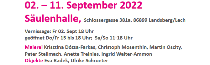 Künstler sind täglich außer Sonntag, und Feiertag von 14 – 20 Uhr selbst anwesend.